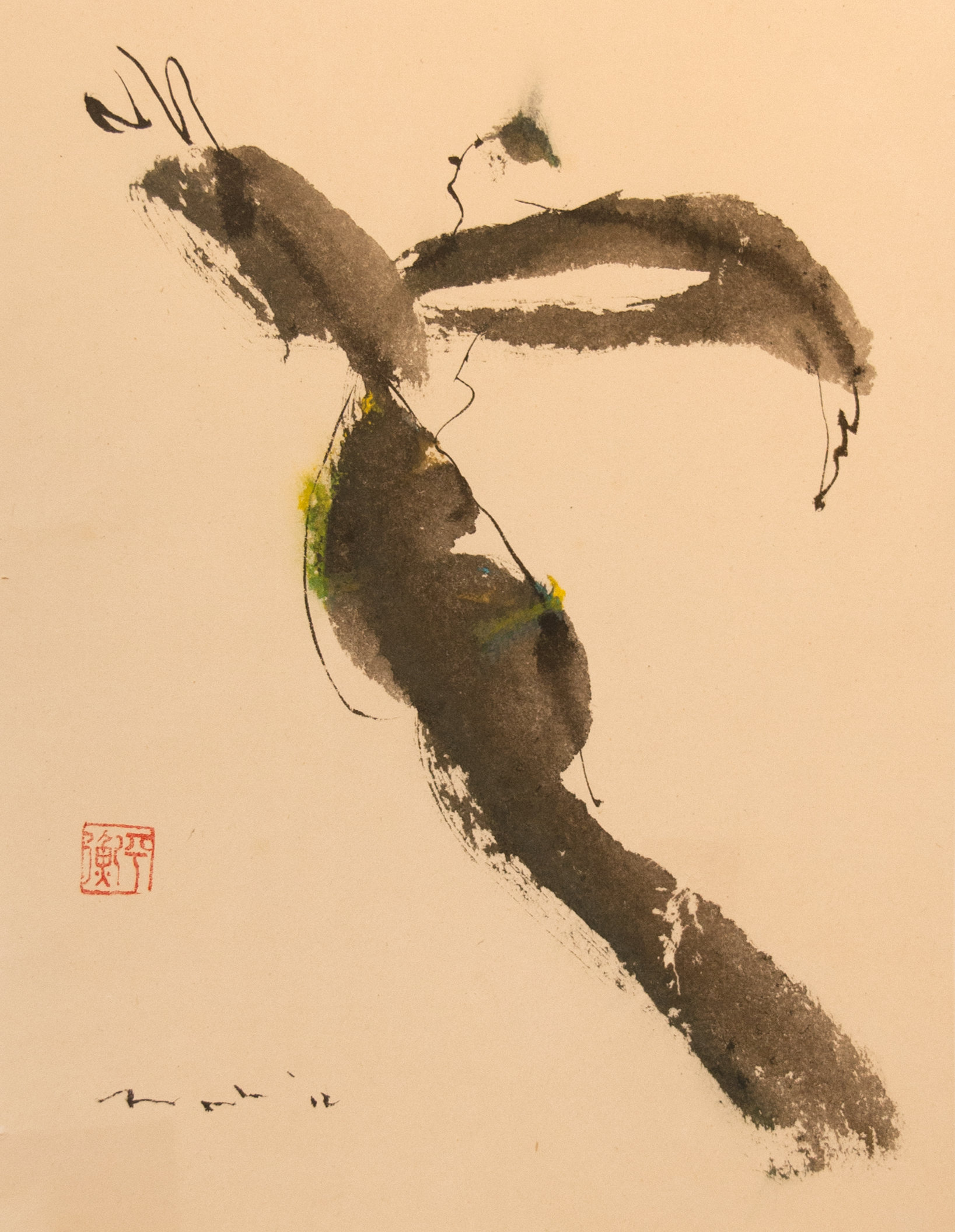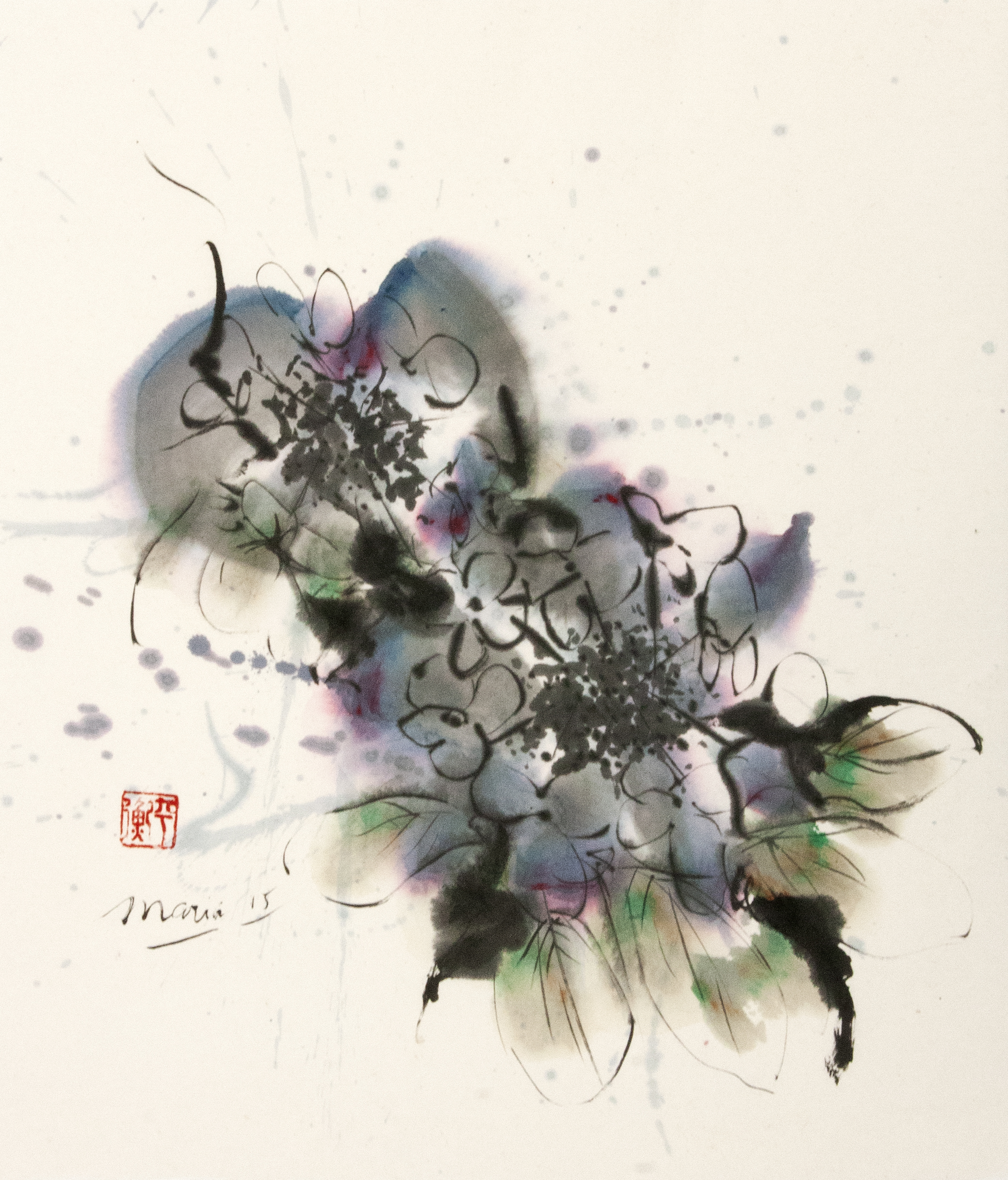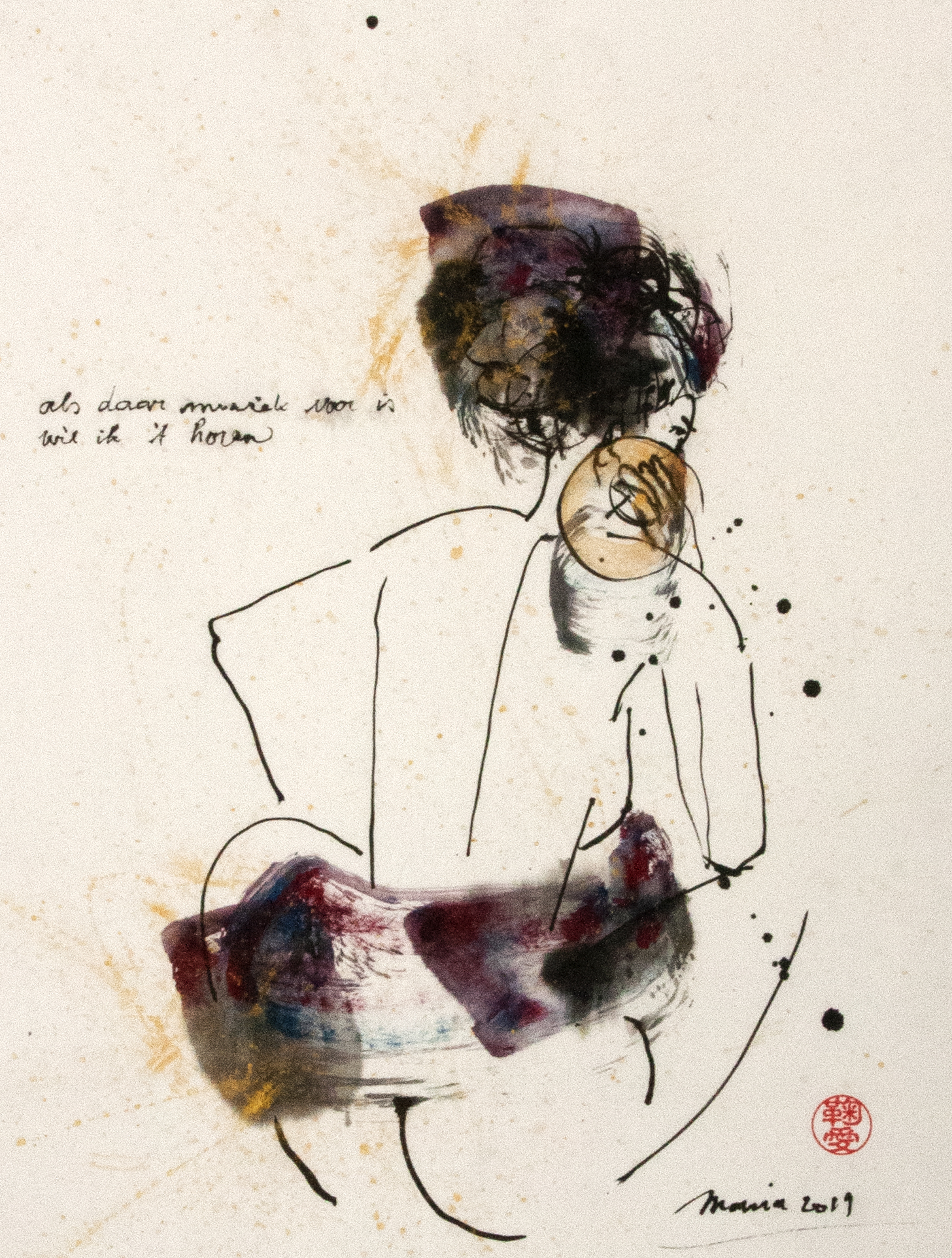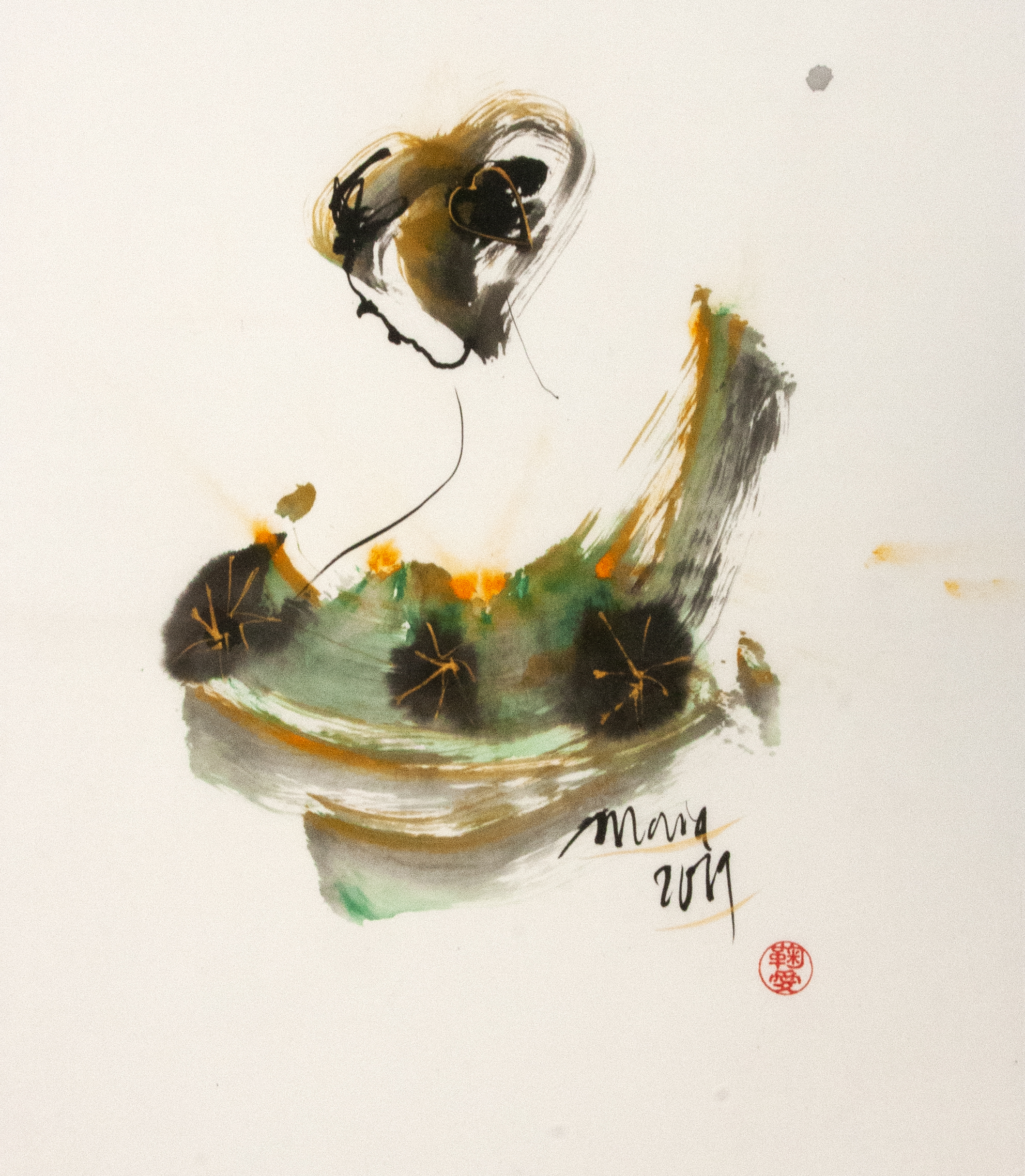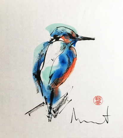Sumi-e (ink-picture) has its roots in Chinese calligraphy and Japanese Zen Buddhism. It is about a minimum of brush strokes and a maximum of imagination. The goal is to show the very essence of the subject (often from nature). Working with ink on highly absorbent paper makes it impossible to correct anything or to work slowly. It is a technique in which you have to look very carefully and put something down in one go. You need to empty, open up. Until you touch the very essence of your subject in lines and spots, light and dark and leaving paper blank. Van der Aalsvoort has been focusing on sumi-e for more than ten years and was taught by sumi-e painter Komori Fumio in Kyoto. She has developed her own style, for example by also using colour and in freedom of subjects.
