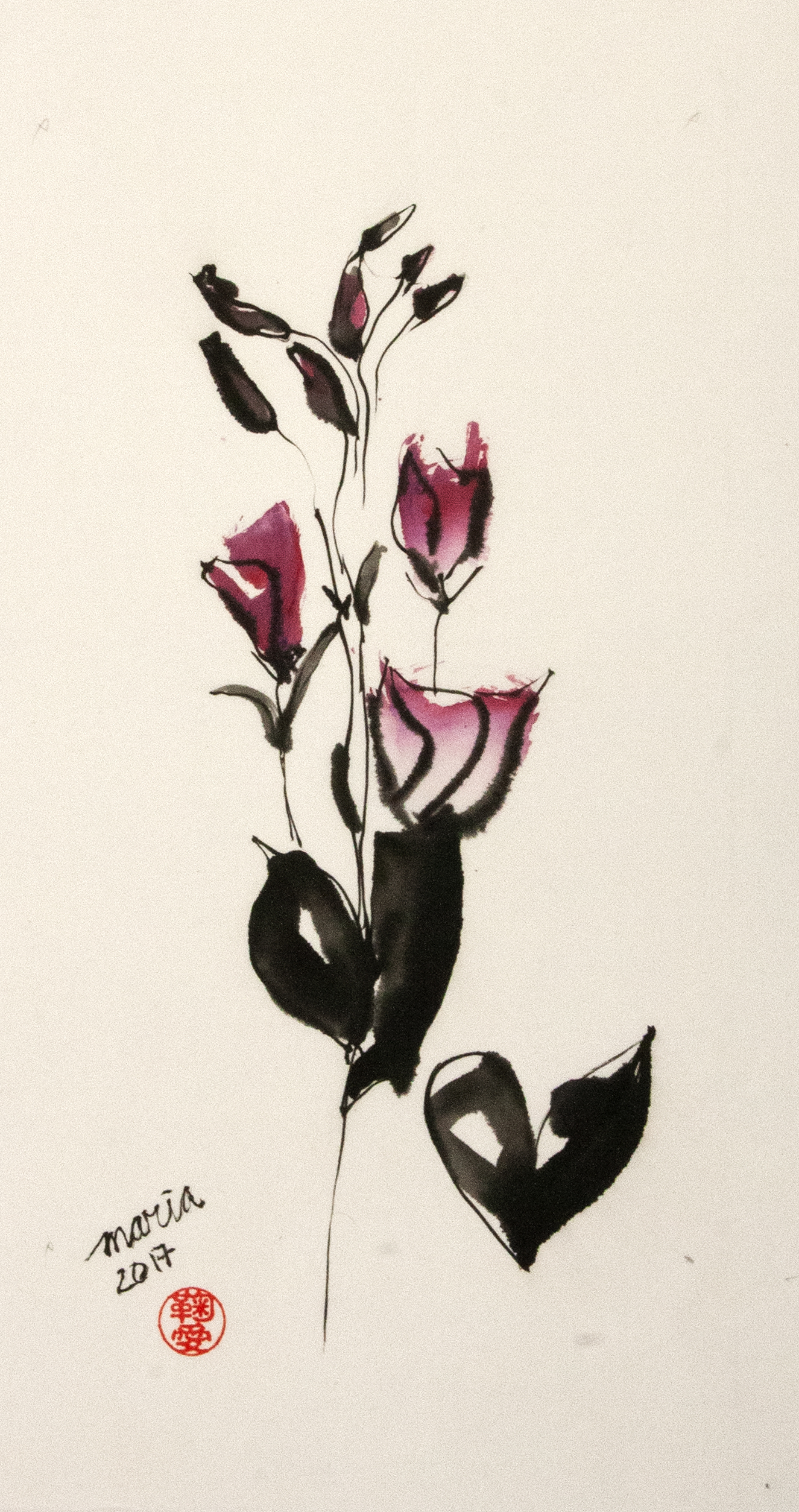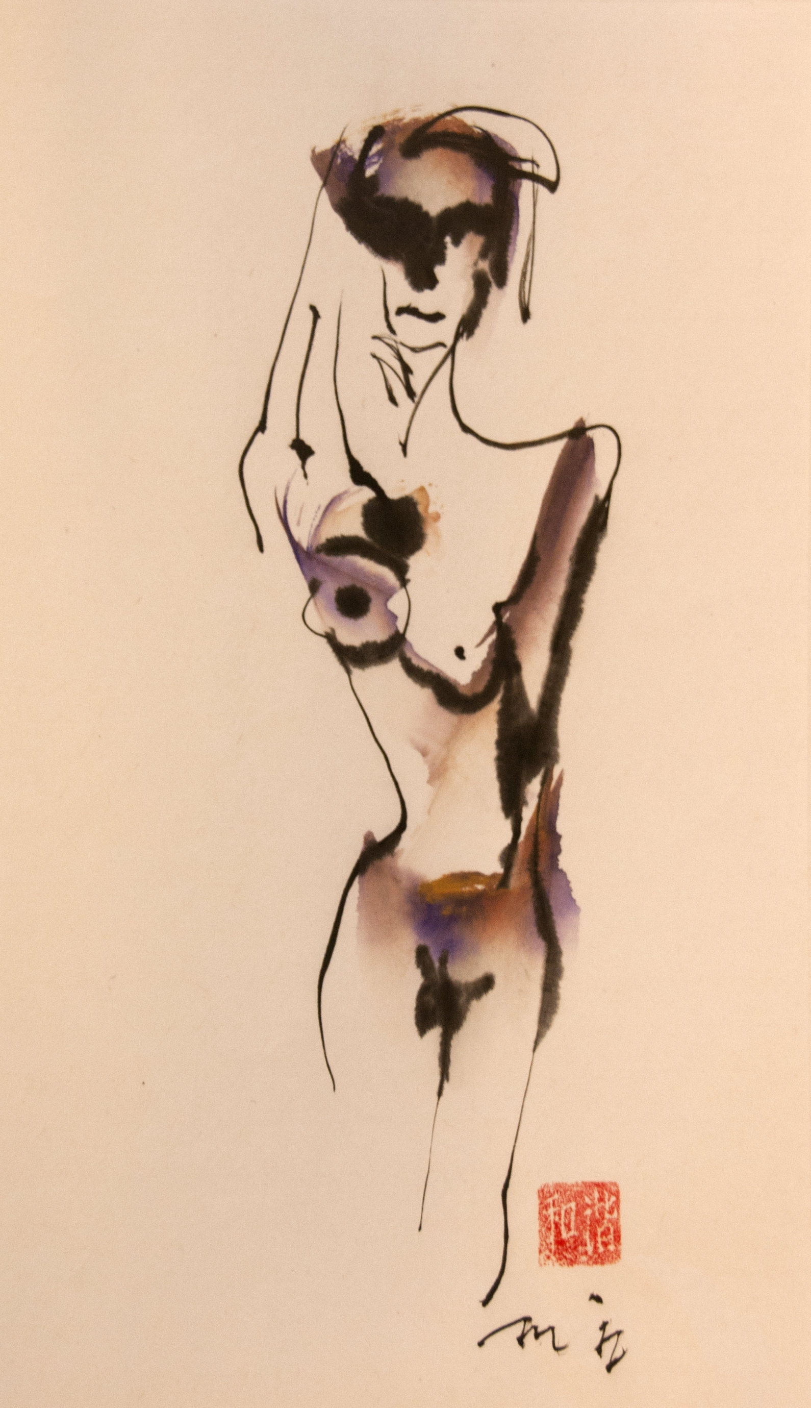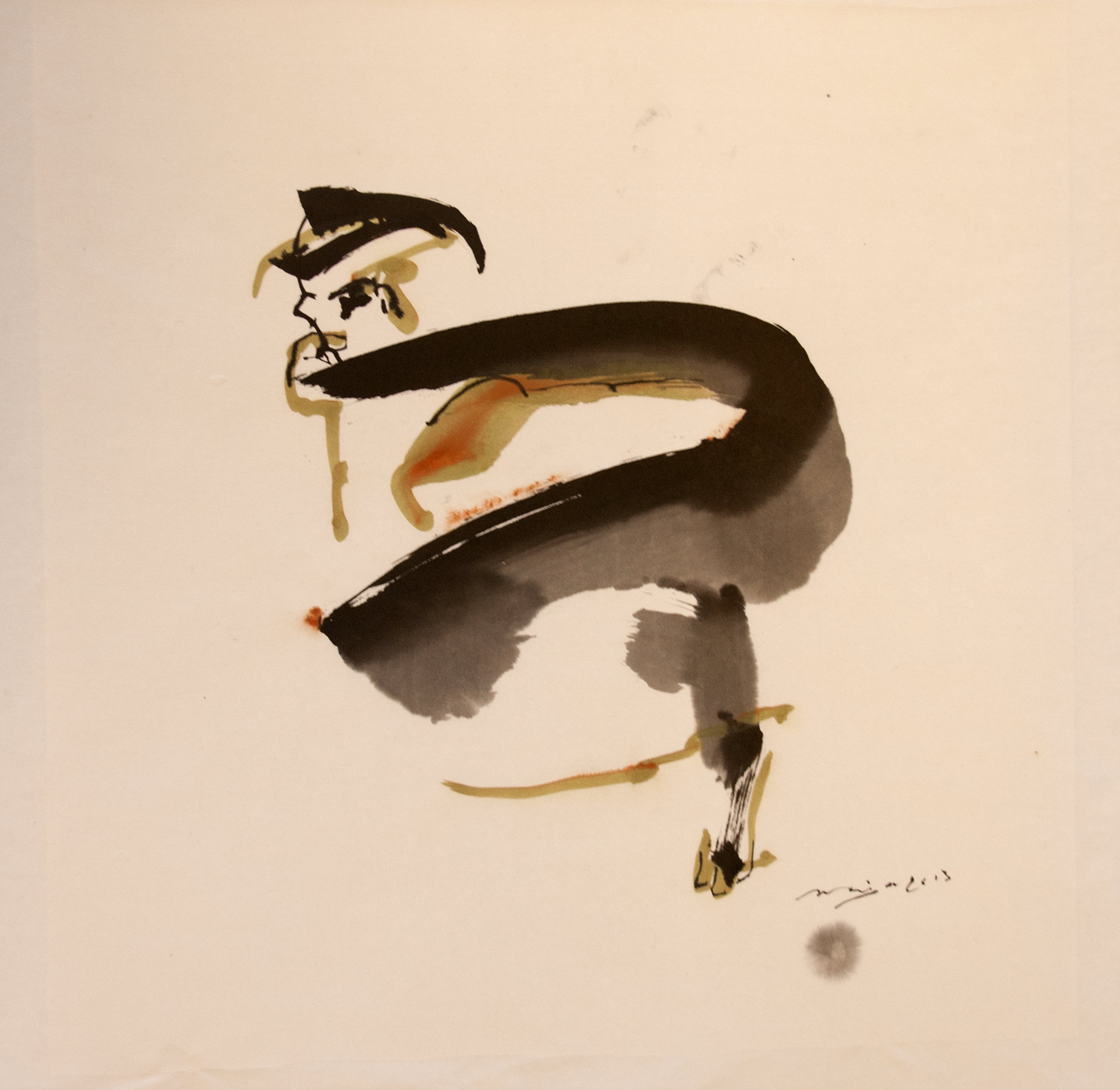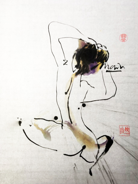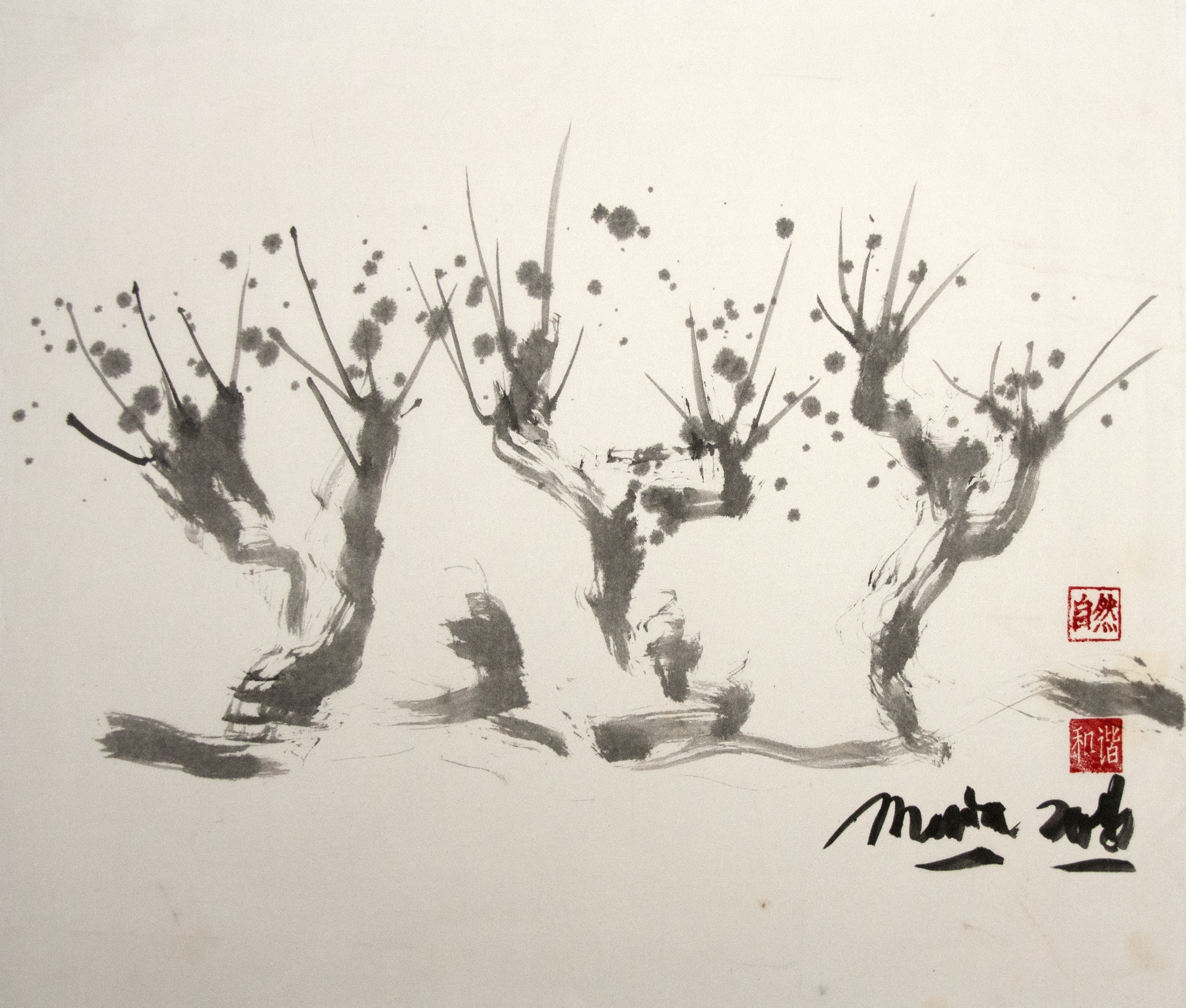Sumi-e (ink-picture) has its roots in Chinese calligraphy and Japanese Zen Buddhism. It is about a minimum of brush strokes and a maximum of imagination. The goal is to show the very essence of the subject (often from nature). Working with ink on highly absorbent paper makes it impossible to correct anything or to work slowly. It is a technique in which you have to look very carefully and put something down in one go. You need to empty, open up. Until you touch the very essence of your subject in lines and spots, light and dark and leaving paper blank. Van der Aalsvoort has been focusing on sumi-e for more than ten years and was taught by sumi-e painter Komori Fumio in Kyoto. She has developed her own style, for example by also using colour and in freedom of subjects.