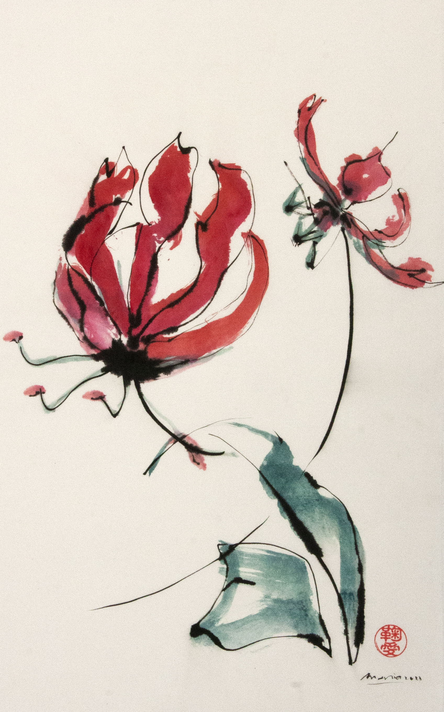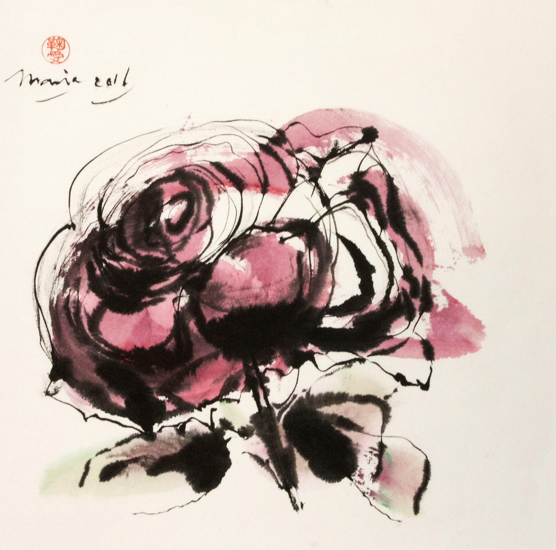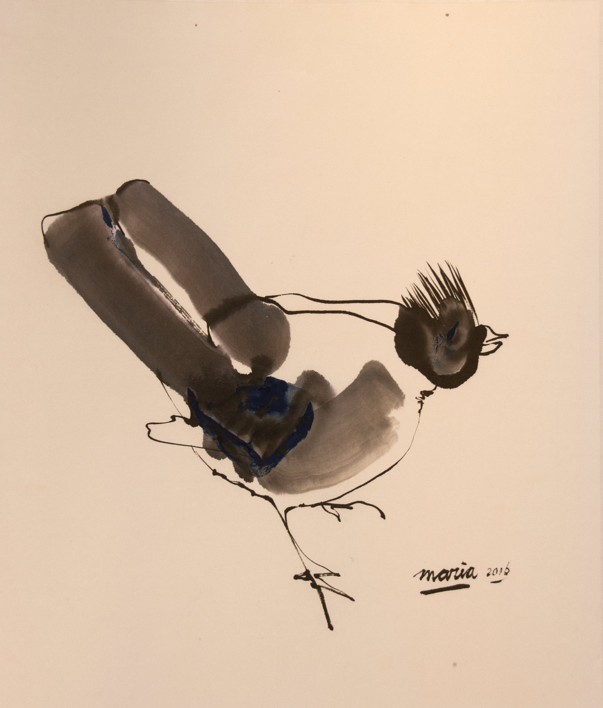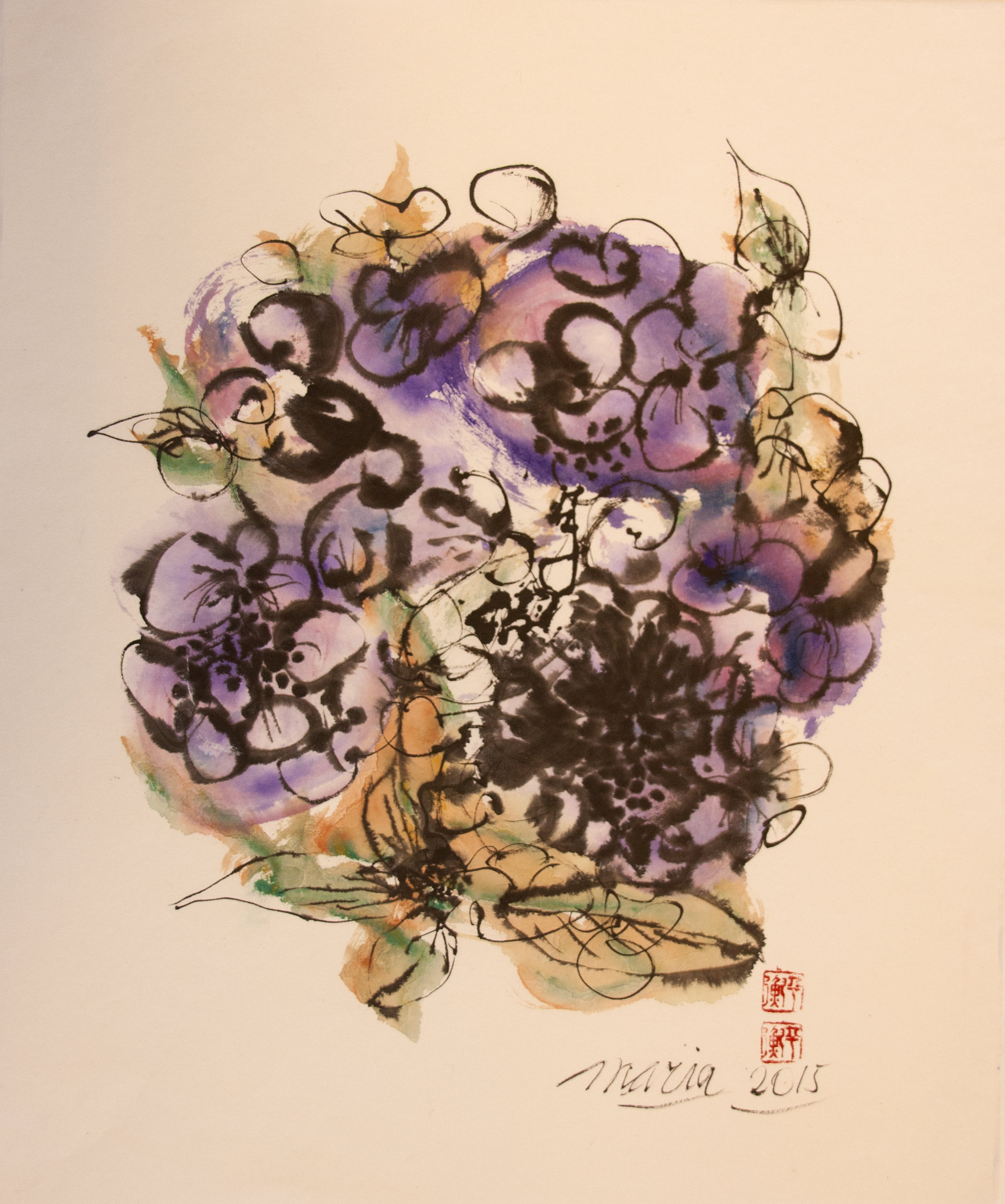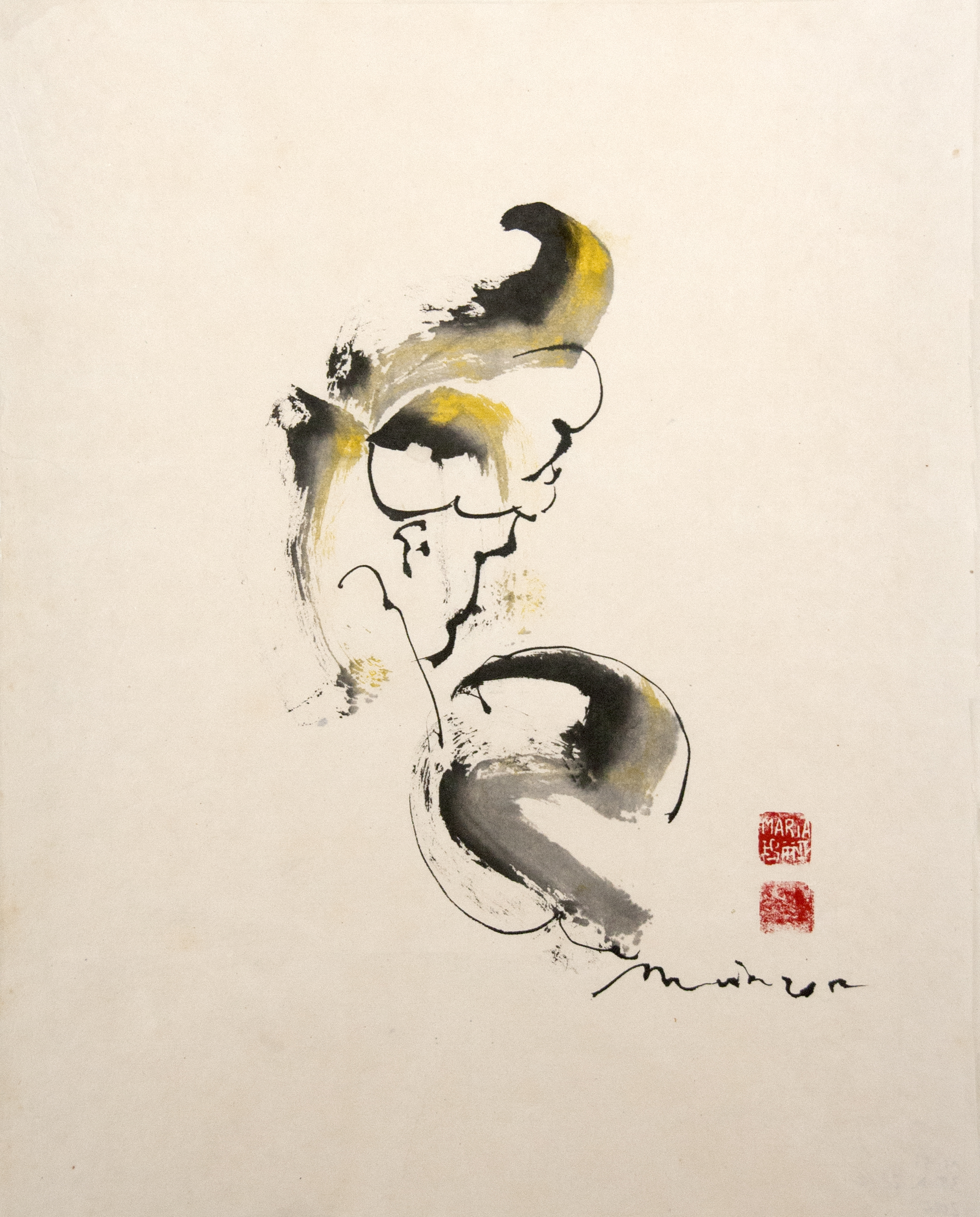 Sumi-e (ink-picture) has its roots in Chinese calligraphy and Japanese Zen Buddhism. It is about a minimum of brush strokes and a maximum of imagination. The goal is to show the very essence of the subject (often from nature). Working with ink on highly absorbent paper makes it impossible to correct anything or to work slowly. It is a technique in which you have to look very carefully and put something down in one go. You need to empty, open up. Until you touch the very essence of your subject in lines and spots, light and dark and leaving paper blank. Van der Aalsvoort has been focusing on sumi-e for more than ten years and was taught by sumi-e painter Komori Fumio in Kyoto. She has developed her own style, for example by also using colour and in freedom of subjects.