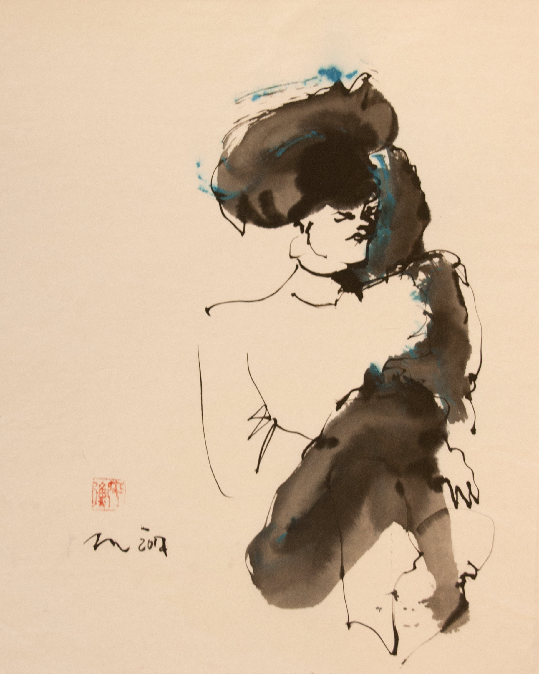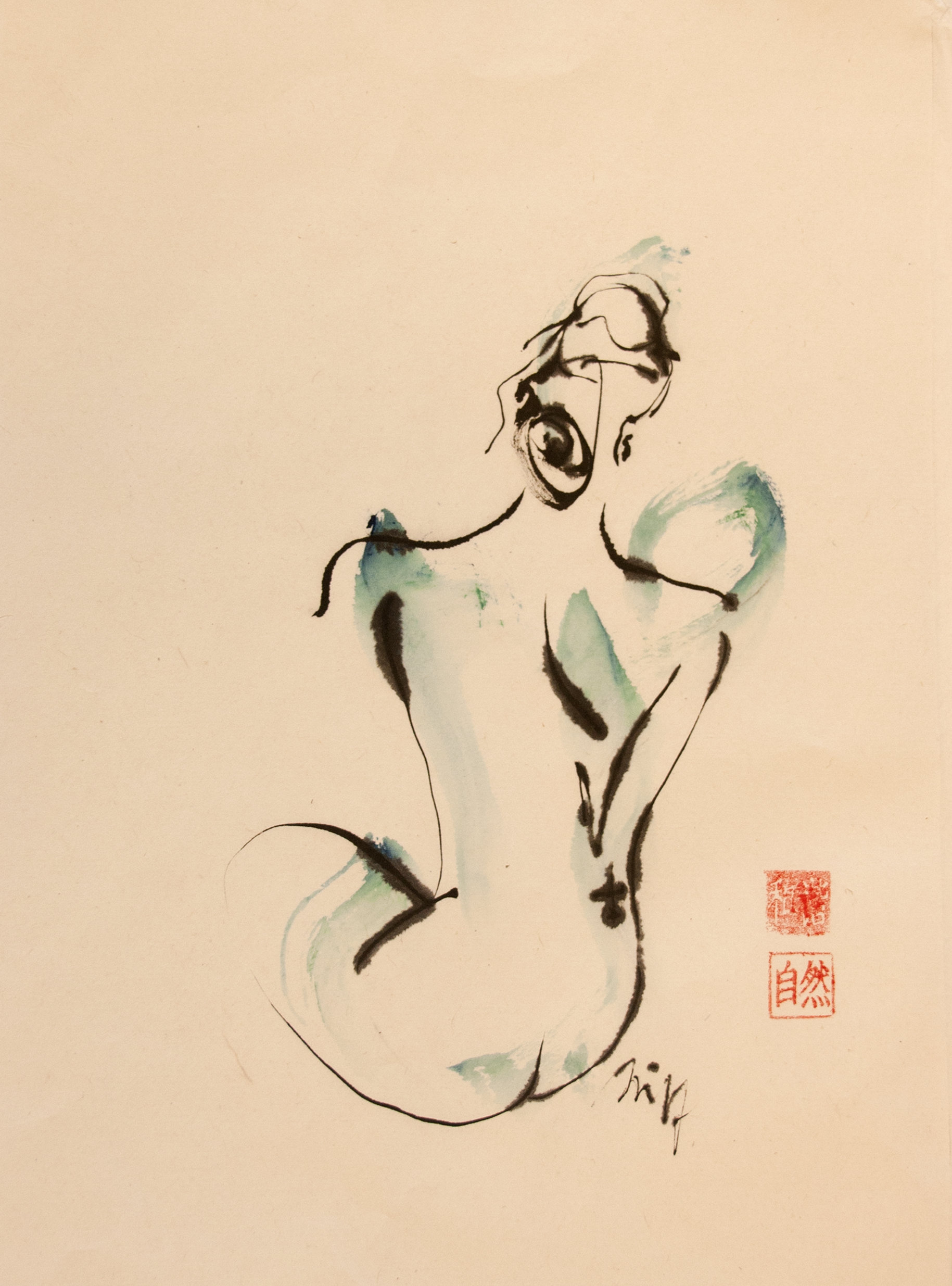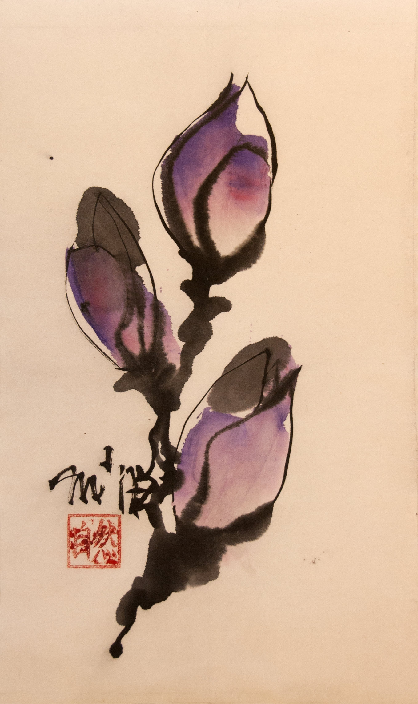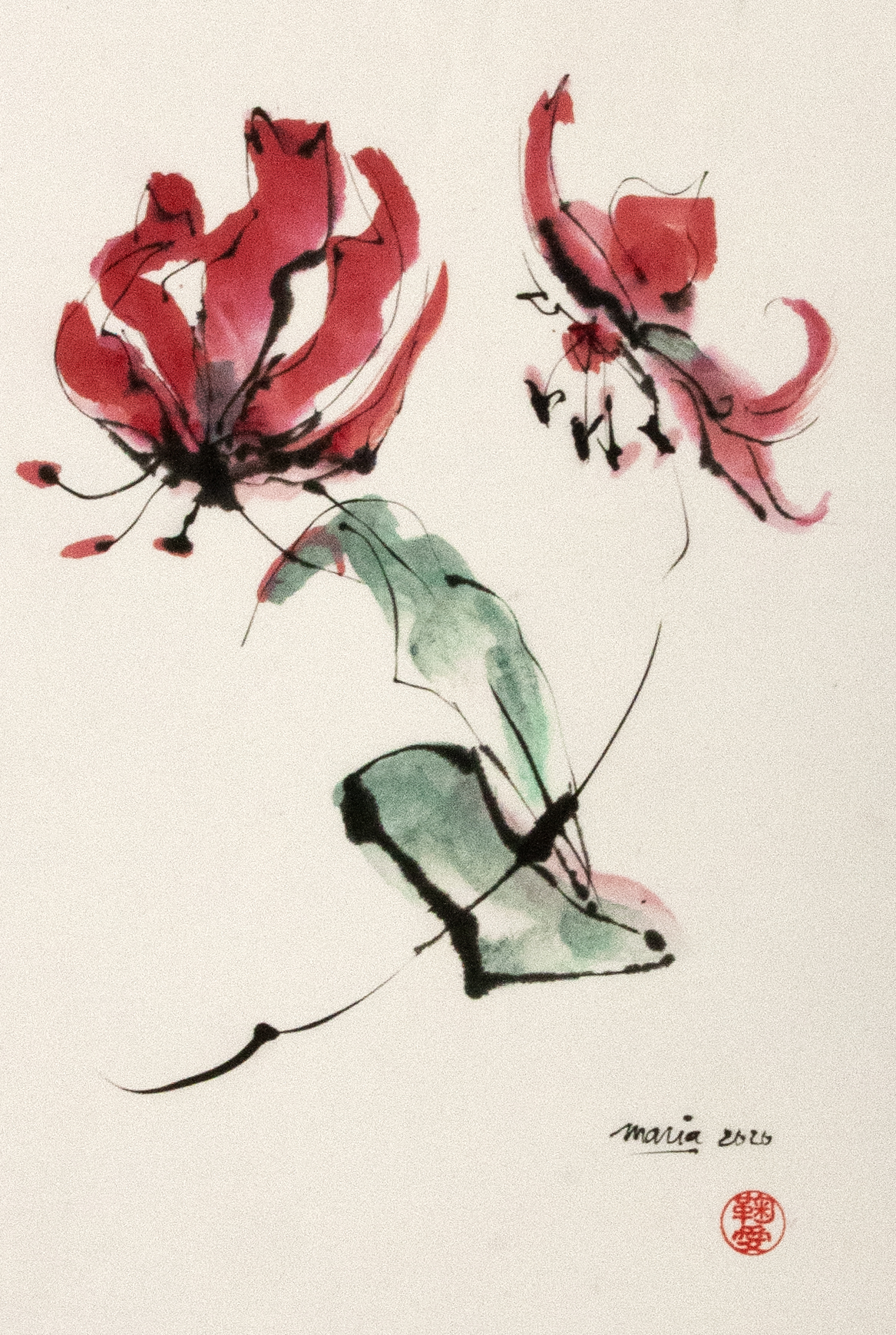 Sumi-e (ink-picture) has its roots in Chinese calligraphy and Japanese Zen Buddhism. It is about a minimum of brush strokes and a maximum of imagination. The goal is to show the very essence of the subject (often from nature). Working with ink on highly absorbent paper makes it impossible to correct anything or to work slowly. It is a technique in which you have to look very carefully and put something down in one go. You need to empty, open up. Until you touch the very essence of your subject in lines and spots, light and dark and leaving paper blank. Van der Aalsvoort has been focusing on sumi-e for more than ten years and was taught by sumi-e painter Komori Fumio in Kyoto. She has developed her own style, for example by also using colour and in freedom of subjects.