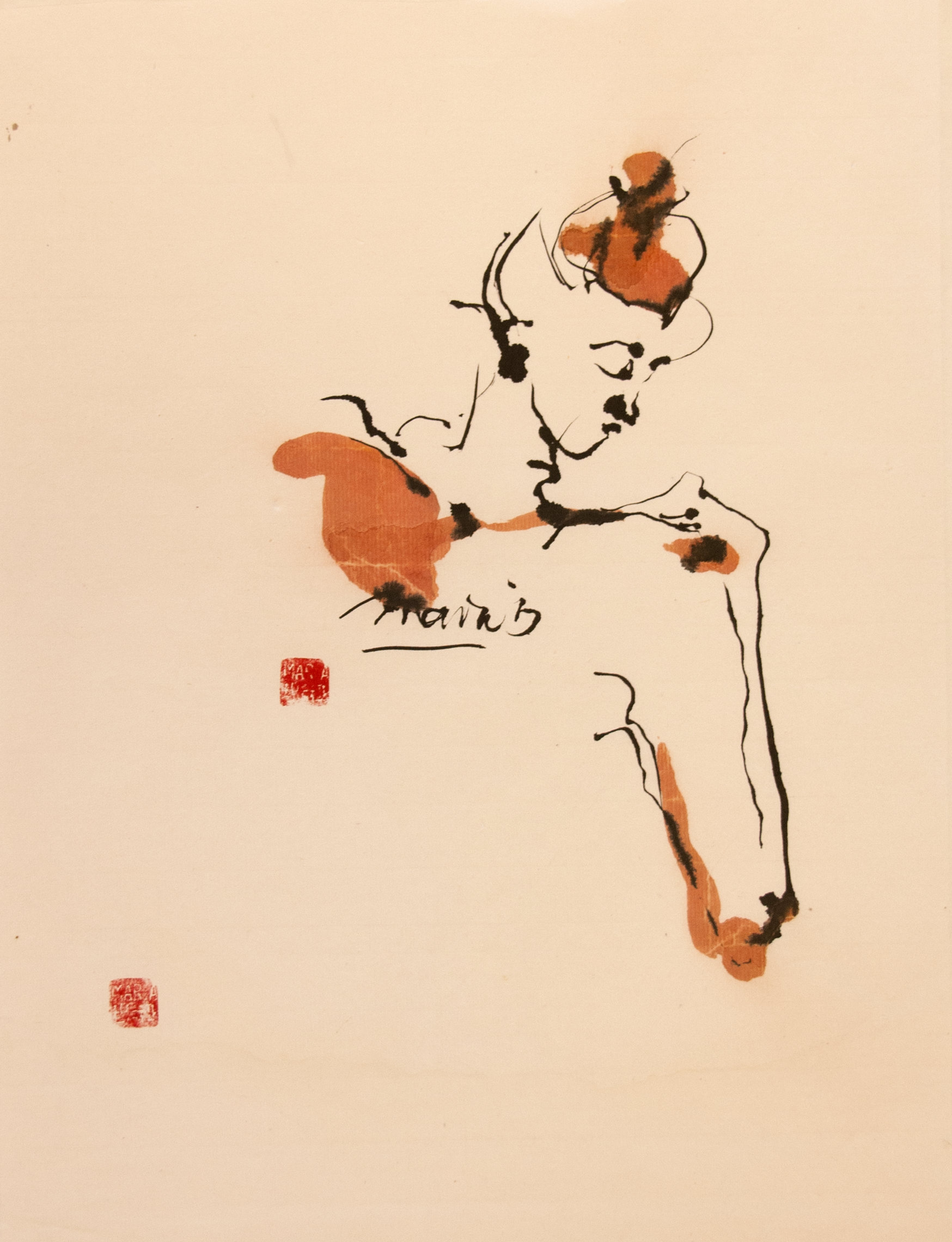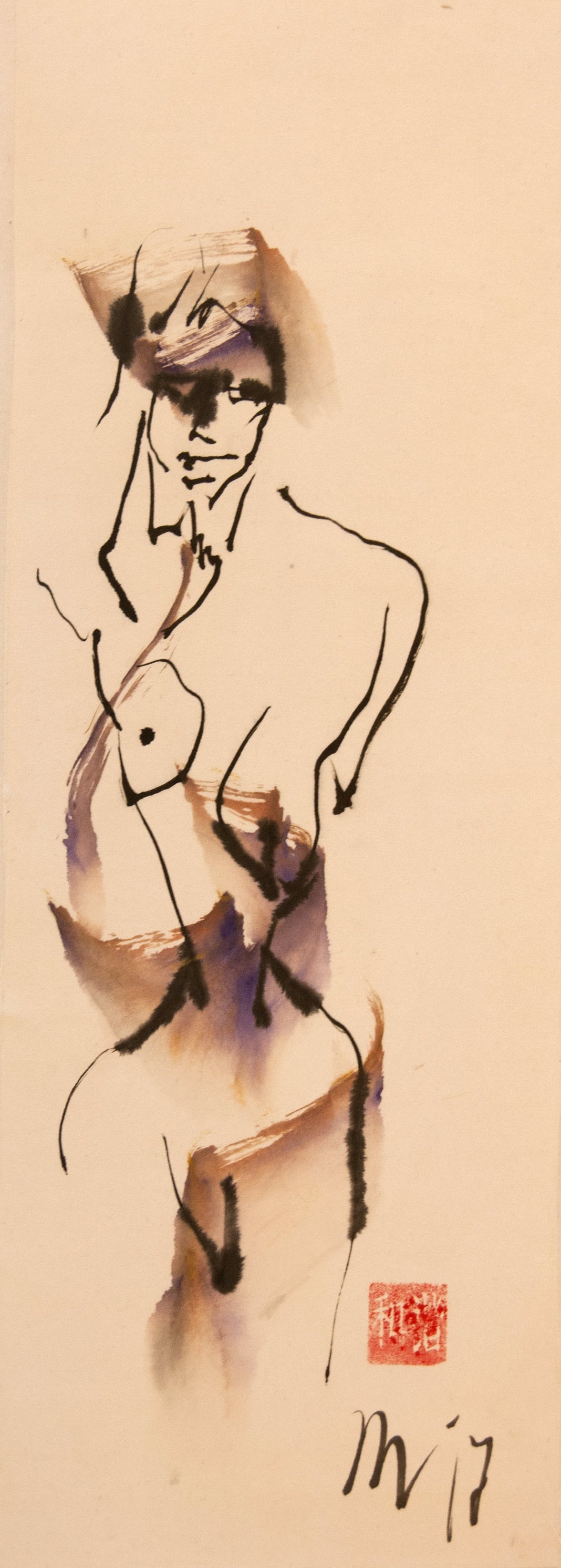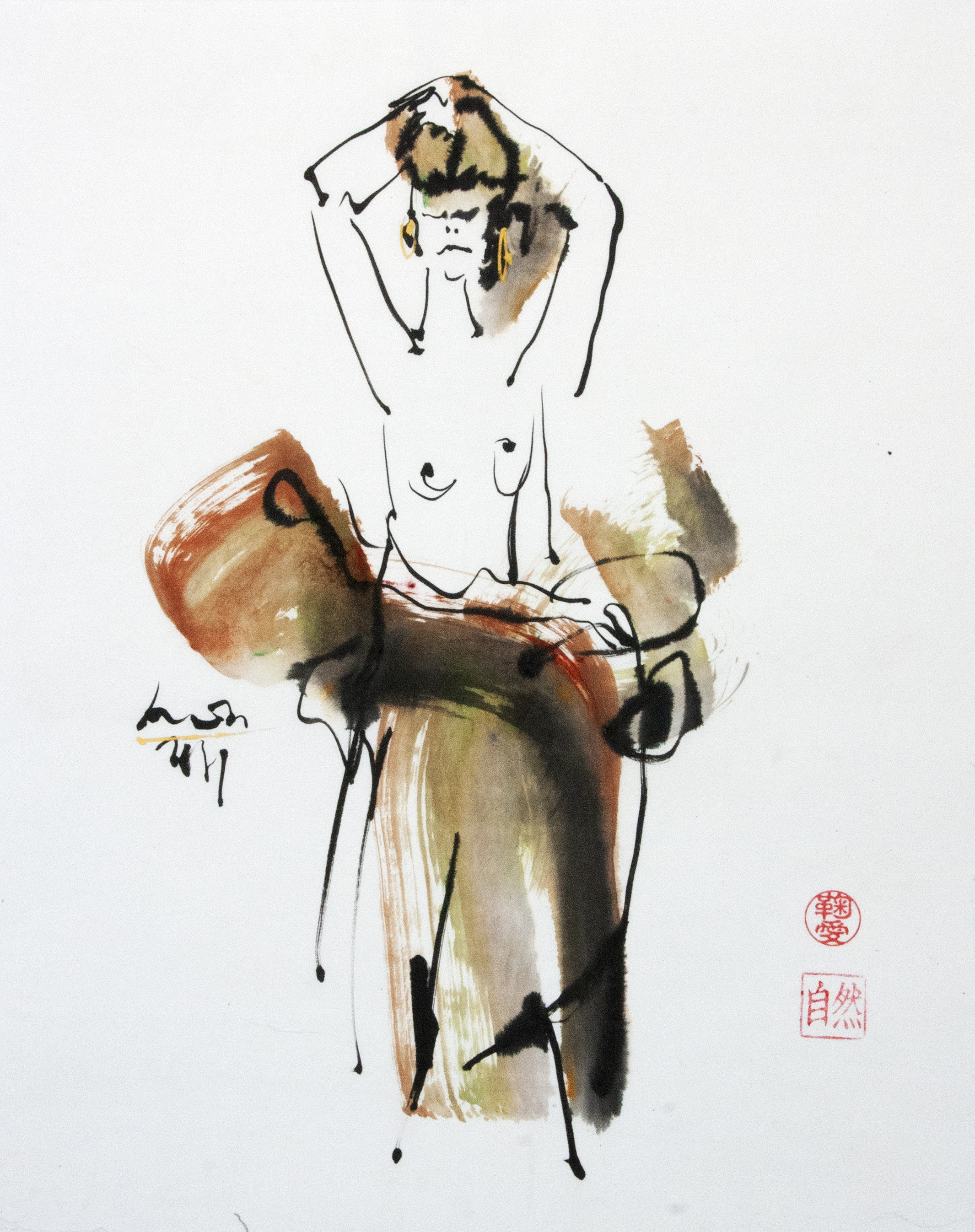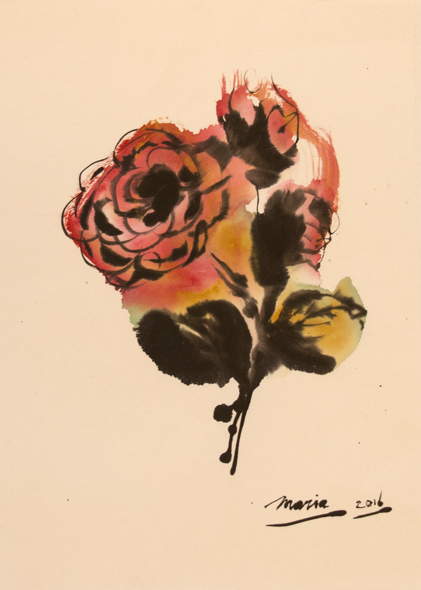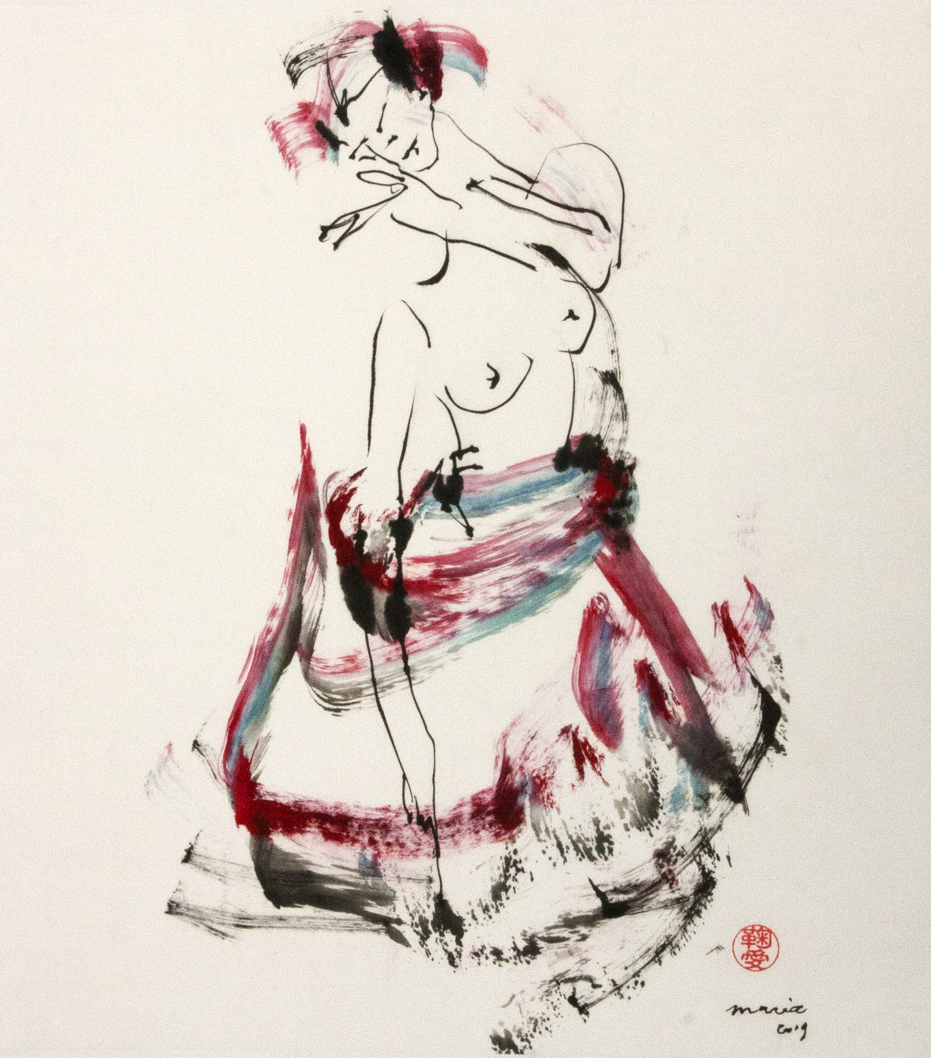 Sumi-e (ink-picture) has its roots in Chinese calligraphy and Japanese Zen Buddhism. It is about a minimum of brush strokes and a maximum of imagination. The goal is to show the very essence of the subject (often from nature). Working with ink on highly absorbent paper makes it impossible to correct anything or to work slowly. It is a technique in which you have to look very carefully and put something down in one go. You need to empty, open up. Until you touch the very essence of your subject in lines and spots, light and dark and leaving paper blank. Van der Aalsvoort has been focusing on sumi-e for more than ten years and was taught by sumi-e painter Komori Fumio in Kyoto. She has developed her own style, for example by also using colour and in freedom of subjects.